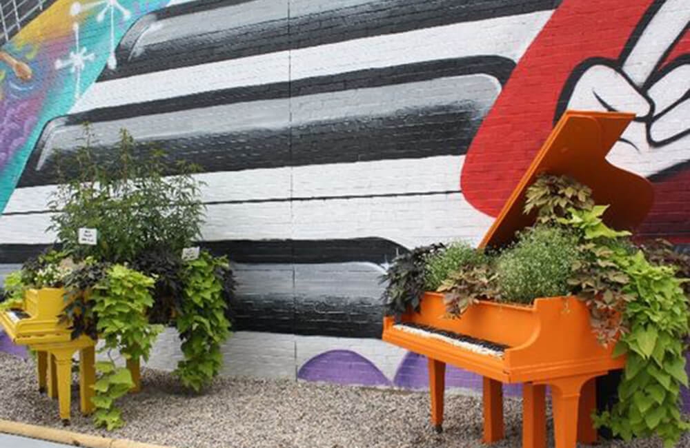 A pocket park, Harmony Park boasts a musical theme with sculptural outdoor instruments, colorfully painted umbrellas, and flowers overflowing from grand pianos.