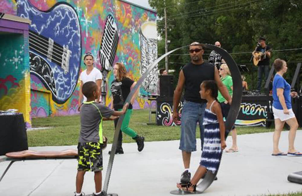 Sculptural benches, originally intended for Big Four Station but in storage for the last 18 months, complete the park. The park also features interactive large scale musical instruments.